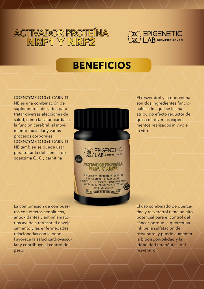 NRF1 (Factor Nuclear Eritroide 2-Relacionado 1) Biogénesis mitocondrial: Regula genes involucrados en la producción y función de mitocondrias. Metabolismo energético: Participa en el control del metabolismo oxidativo. Respuesta al estrés: Ayuda a la célula a adaptarse a cambios en el ambiente y a resistir el daño. NRF2 (Factor Nuclear Eritroide 2-Relacionado 2) Antioxidante: Regula genes que producen antioxidantes, protegiendo contra el daño oxidativo. Detoxificación: Activa la expresión de enzimas que eliminan toxinas. Respuesta al estrés: Protege las células de condiciones estresantes, como inflamación y toxicidad. Ambas proteínas desempeñan un papel crucial en mantener la salud celular y proteger contra el daño ambiental y el envejecimiento. La combinación de resveratrol y coenzima Q10 ofrece varios beneficios para la salud: