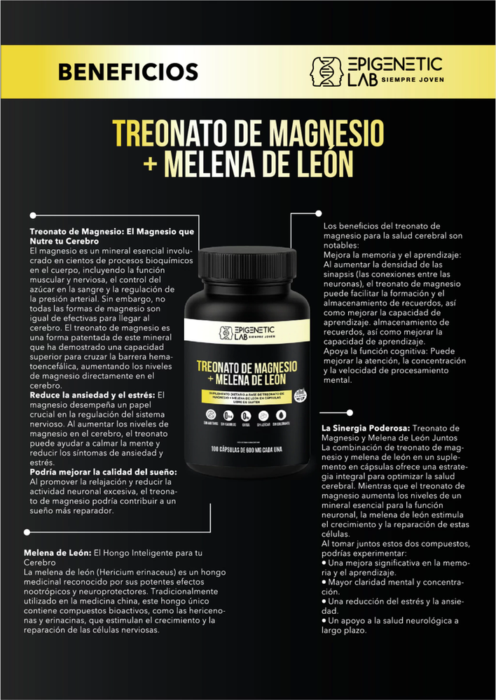 La búsqueda de un rendimiento cognitivo óptimo y una salud cerebral duradera ha popularizado la combinación de ciertos suplementos. El Treonato de Magnesio y el hongo Melena de León (Hericium erinaceus) han emergido como un dúo sinérgico que ofrece un enfoque integral para mejorar la memoria, la concentración y la resiliencia mental.