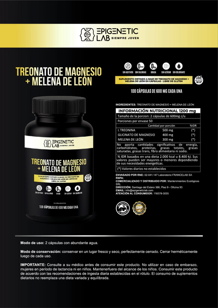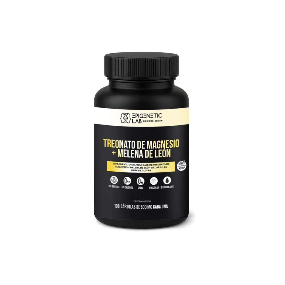 TREONATO DE MAGNESIO + MELENA DE LEON X 100 CAP DE 600 MG SIN TACC VENC: 10/2027