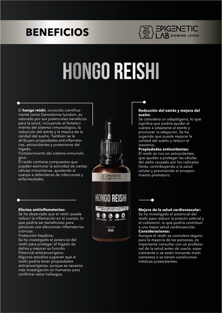 Propiedades Antioxidantes: Los compuestos del Reishi son potentes antioxidantes, lo que significa que pueden combatir el daño causado por los radicales libres en el cuerpo. Este efecto es crucial para la prevención del envejecimiento celular y diversas enfermedades crónicas.