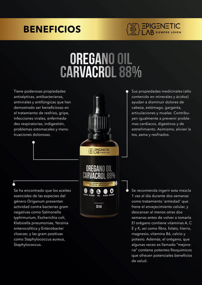 Propiedades y beneficios específicos: Antimicrobiano: El aceite de orégano es efectivo contra bacterias, virus y hongos, lo que lo convierte en un aliado para combatir infecciones.