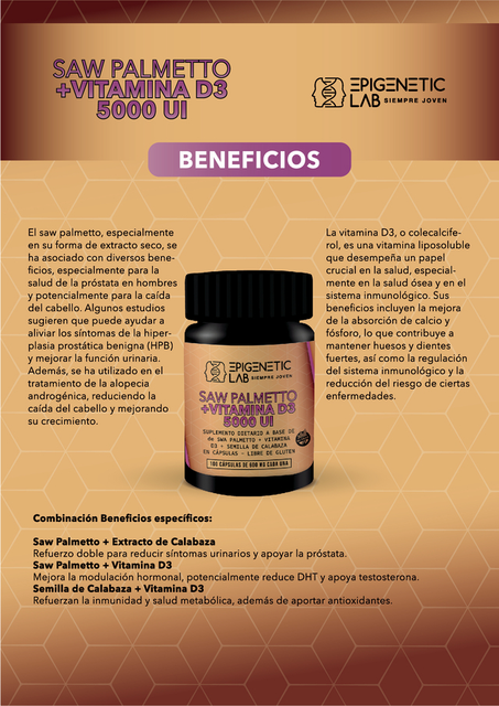 Saw Palmetto + Vitamina D3 5000 UI de Epigenetic Lab Es un suplemento avanzado diseñado para acompañar la salud masculina, fortalecer el sistema inmune y promover un bienestar integral.