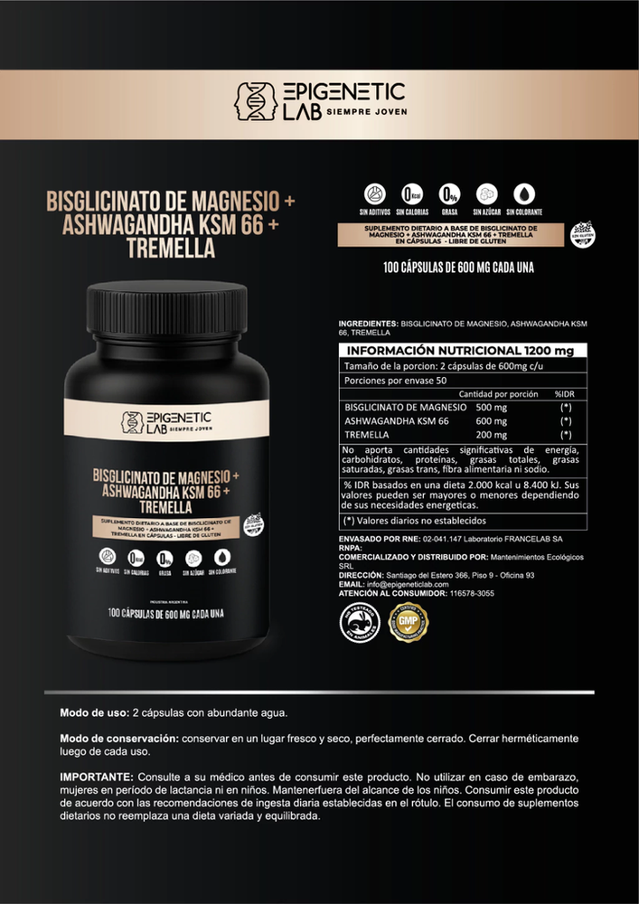 Magnesio y ashwagandha juntos pueden potenciar la relajación, mejorar sueño y recuperación muscular. Tremella suma beneficio sobre la piel y sistema inmune, complementando el efecto reparador de magnesio y la reducción del estrés por ashwagandha. La fórmula sin gluten (sin TACC) la hace apta para celíacos o personas con sensibilidad al gluten, ampliando su accesibilidad. Dosis, formato y ventaja de cápsulas de 600 mg