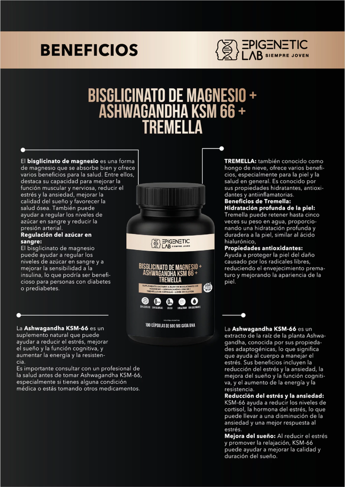Consultar con un profesional de salud antes de iniciar: embarazo, lactancia, enfermedades autoinmunes, hipertensión, trastornos tiroideos o uso de medicamentos (p. ej. sedantes, inmunosupresores, medicamentos para tiroides o diuréticos). Ashwagandha puede interactuar con sedantes, ansiolíticos y medicamentos para la tiroides; en dosis altas puede causar efectos gastrointestinales o somnolencia. El magnesio en exceso puede provocar diarrea, náuseas o alteraciones electrolíticas; la forma bisglicinato reduce este riesgo.