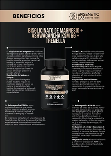 Combina el bisglicinato de magnesio, reconocido por su alta absorción y efecto relajante, con ashawagandha, un adaptógeno natural que ayuda a reducir el estrés y mejorar la energía. Además, incluye tremella, un hongo con propiedades antioxidantes y beneficios para la piel y el sistema inmunológico.